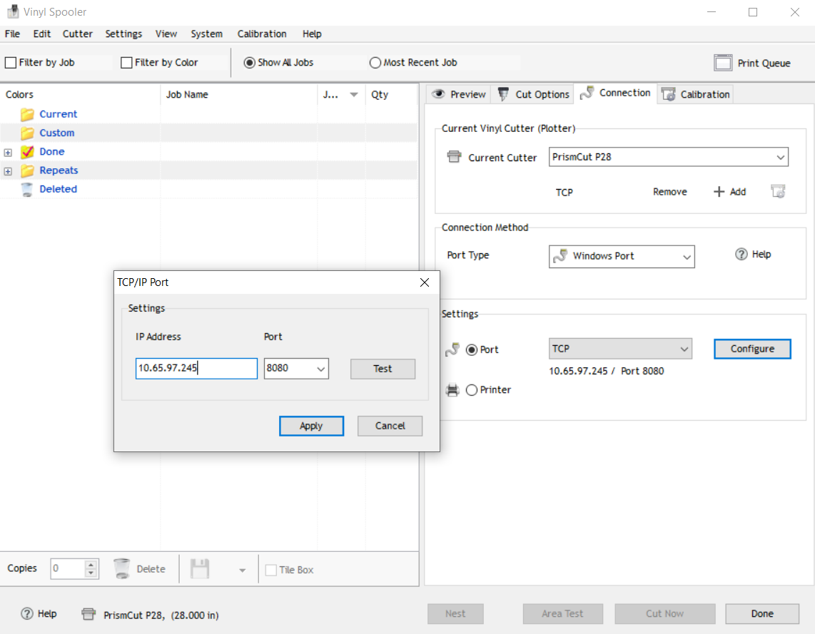 4. VinylMaster will then be able to connect on a Windows Port as TCP on port 8080 if the WiFi module and antenna are both working.